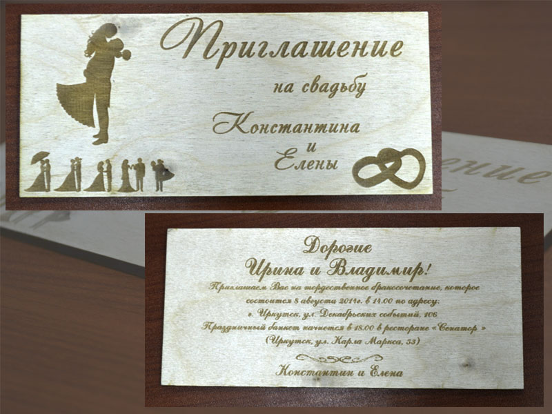 Приглашения на дереве. Вырезаны при помощи лазерной гравировки. Индивидуальны для каждого гостя.