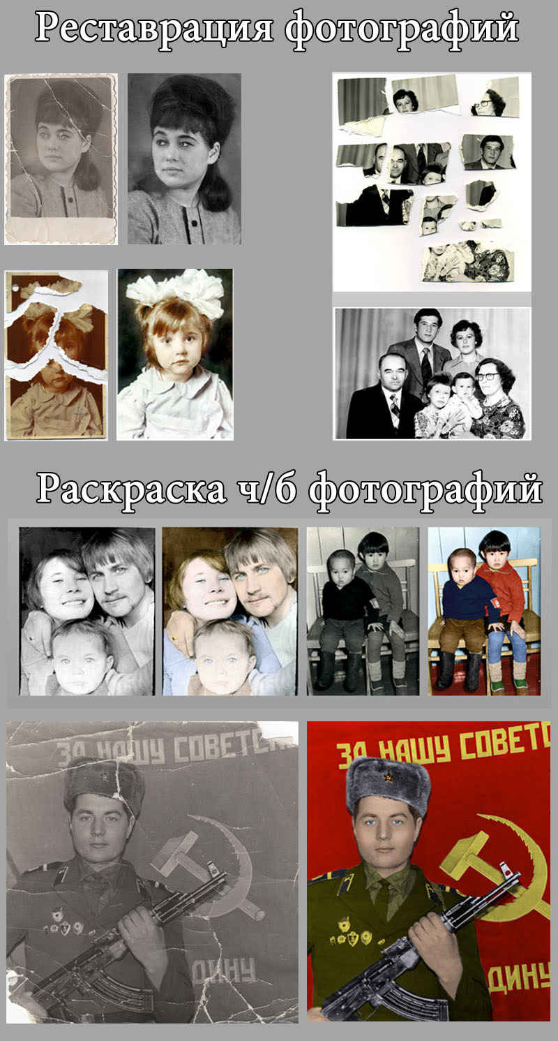 Оказываем услуги по реставрации и раскраске старых фотографий. Занимаются этой работой профессиональные дизайнеры, которые знают толк в своем деле и имеют многолетний опыт. Стоимость будет рассчитана, исходя из затраченного времени и составит 300 р/час. С примерами работ вы можете ознакомиться ниже.